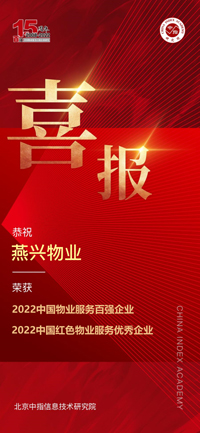 喜報(bào)燕興物業(yè)榮獲中國物業(yè)服務(wù)百強(qiáng)企業(yè)TOP482022中國紅色物業(yè)服務(wù)優(yōu)秀企業(yè)特此喜報(bào),再創(chuàng)佳績2022年4月26日,由北京中指信息技術(shù)研究院主辦,北京中指信息技術(shù)研究院中國房地產(chǎn)TOP10研究組、中國... 2022-04-27